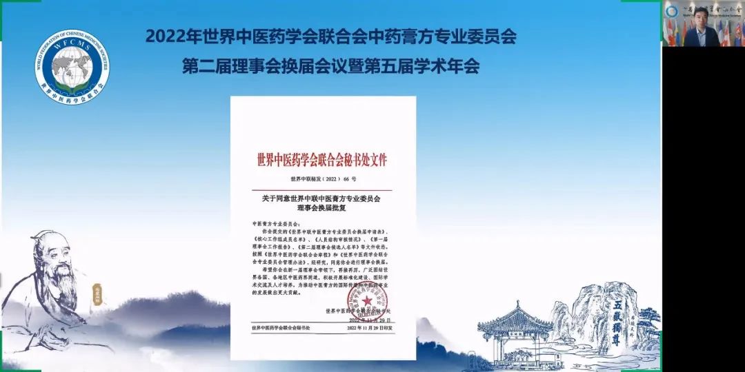 2022年12月4日上午,世界中醫(yī)藥學會聯(lián)合會(世界中聯(lián))中醫(yī)膏方專業(yè)委員會第二屆理事會換屆會議暨第五屆學術(shù)年會通過線上方式隆重召開。世界中聯(lián)主席馬建中向大會發(fā)來視頻致辭,學術(shù)部主任焦云洞代表世界中聯(lián)參加大會,全國政協(xié)委員、首都名中醫(yī)、享受國務院政府特殊津貼專家、世界中聯(lián)中醫(yī)膏方專業(yè)委員會會長、北京康益德中西醫(yī)結(jié)合肺科醫(yī)院董事長兼院長董瑞和顧問、副會長、常務理事、理事及會員共335人參加了大會。其中來自匈牙利、葡萄牙、澳大利亞、俄羅斯、瑞典、波蘭、英國、美國、芬蘭、韓國、中國香港、中國澳門、中國臺灣等地的外籍專家學者65人。會議由第一屆理事會秘書長秦洪義教授主持。