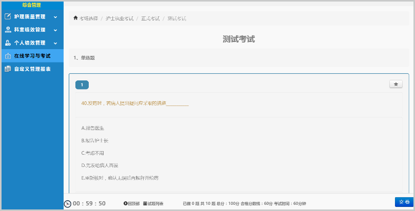 針對醫(yī)院等級評審和日常護理管理需要,護理在線學習與考試系統(tǒng),可以方便地完成全程在線學習、考試、統(tǒng)計以及持續(xù)跟蹤,試題設(shè)置、一鍵下發(fā),在線學習、省心省力。