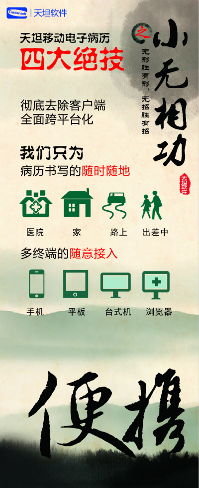 在全球范圍,向移動互聯(lián)網(wǎng)推進的浪潮已經(jīng)勢不可擋, 醫(yī)療行業(yè)如其他行業(yè)一樣,要想更好地發(fā)展,必須融入這個浪潮。天坦軟件通過多年的努力,打造出“天坦移動電子病歷”,加強了醫(yī)院管理效率和力度,避免醫(yī)療差錯和事故,改善醫(yī)患關(guān)系,減少醫(yī)患矛盾,提高醫(yī)護人員的工作效率,提高醫(yī)療服務(wù)響應(yīng)能力,隨時隨地為患者服務(wù)。